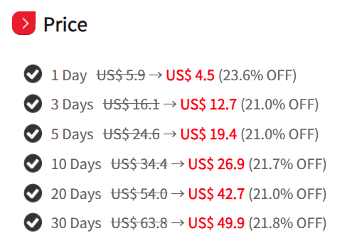 Product package : 5 days, 10 days, 30 days